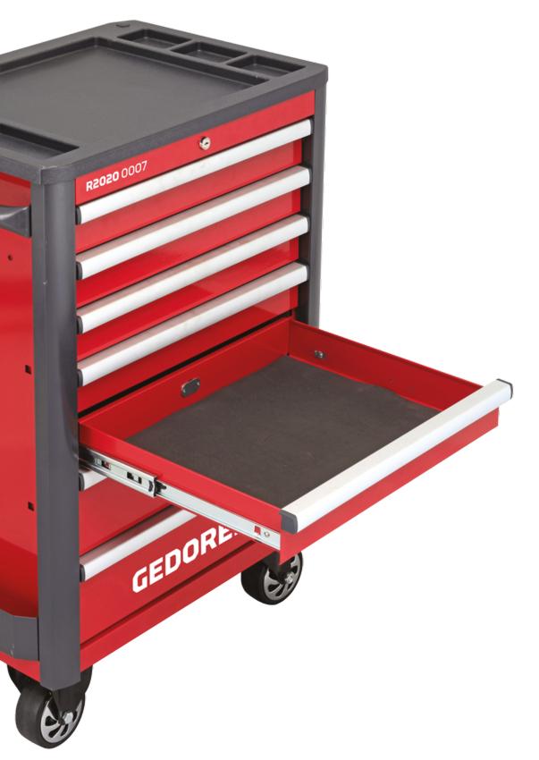GEDORE Red R20200007 WERKSTATTWAGEN WINGMAN MIT 7 SCHUBLADEN • Solide Stahlblechkonstruktion, verwindungssteif, hoch belastbar • Arbeitsplattform mit Abdeckung aus ABS-Kunststoff • Seitenwände mit Vierkantlochung für Zubehör, mit Papierrollenhalter, Dosenhalter und Papierkorb • Beidseitig großer Fahrgriff • 7 Schubladen mit Teleskop-Vollauszug mit Einzelverriegelung (Einhandbedienung) • Die Einzelauszugssperre verhindert das Öffnen von mehr als einer Schublade, dadurch hohe Standsicherheit • Tragfähigkeit 35 kg per Schublade • Schubladeninnenmaß: B 570 x T 410 mm • 5 Schubladen Blendenhöhe 83 mm • 2 Schubladen Blendenhöhe 155 mm • Schubladen mit Antirutschmatte • Zentralverriegelung mit Zylinderschloss mit 4 Schlüsseln • 2 Lenkrollen Ø 125 mm mit Radfeststeller, 2 Laufrollen • Maße: H 1034 x B 724 x T 470 mm (ohne Griff)